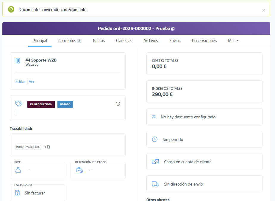 En la siguiente imagen se muestra un documento tipo Pedido.