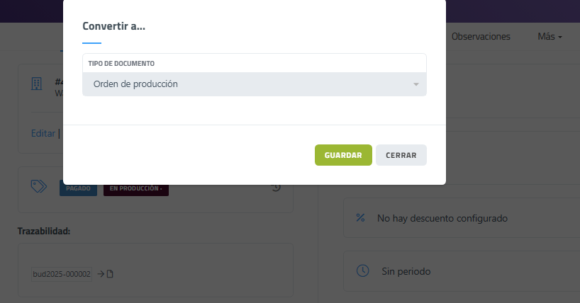 - Al hacer clic en botón "Guardar" lleva a la página de la orden de producción del pedido que se ha creado.