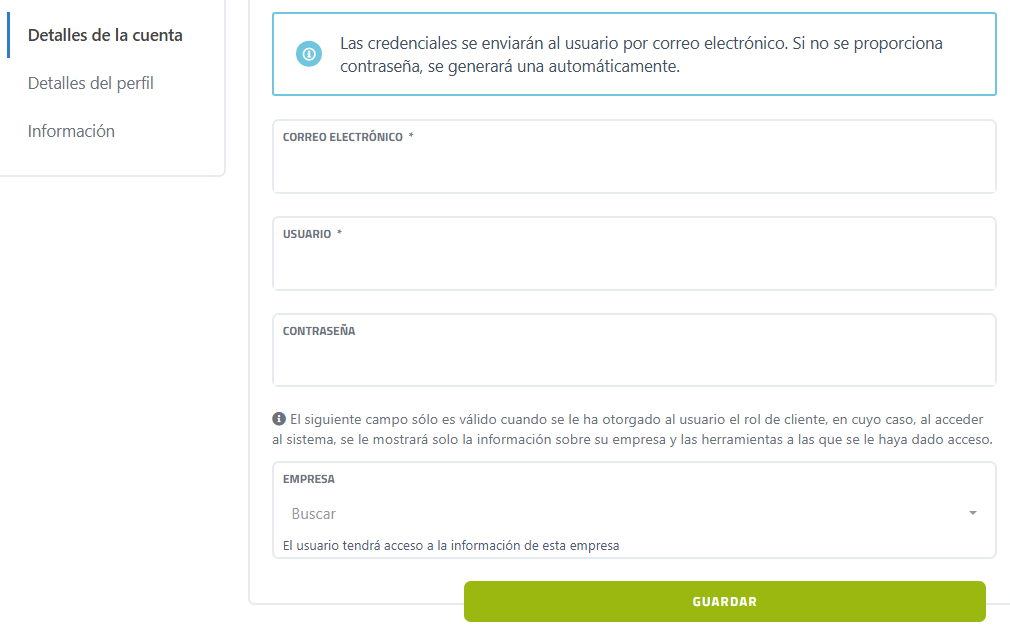 El campo empresa sólo es para cuando a un usuario se le ha otorgado el rol de cliente, en cuyo caso, al acceder al sistema, se le mostrará solo la información sobre su empresa y las herramientas a las que se le haya dado acceso. Requiere guardado.