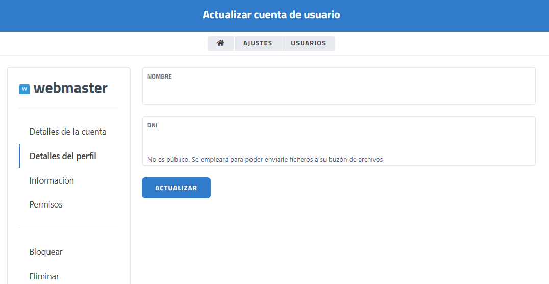 Aquí se le asigna un nombre al perfil del usuario. Se puede asignar un DNI para poderle enviar ficheros a su buzón de archivos. No es público. Requiere hacer clic en botón actualizar par guardar cambios.
