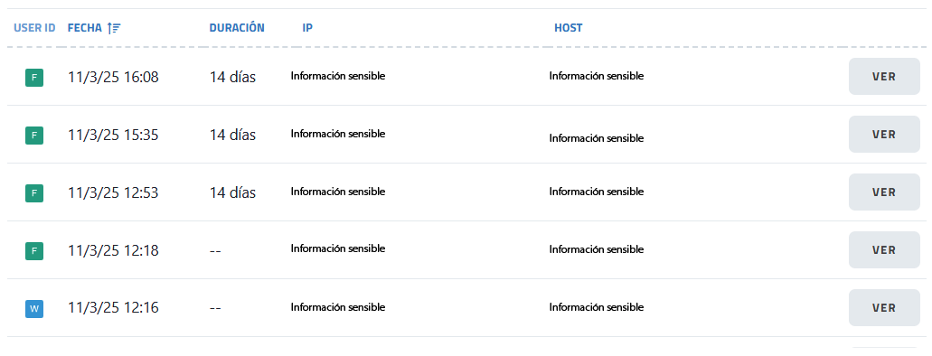 Accede a un histórico de sesiones iniciadas.