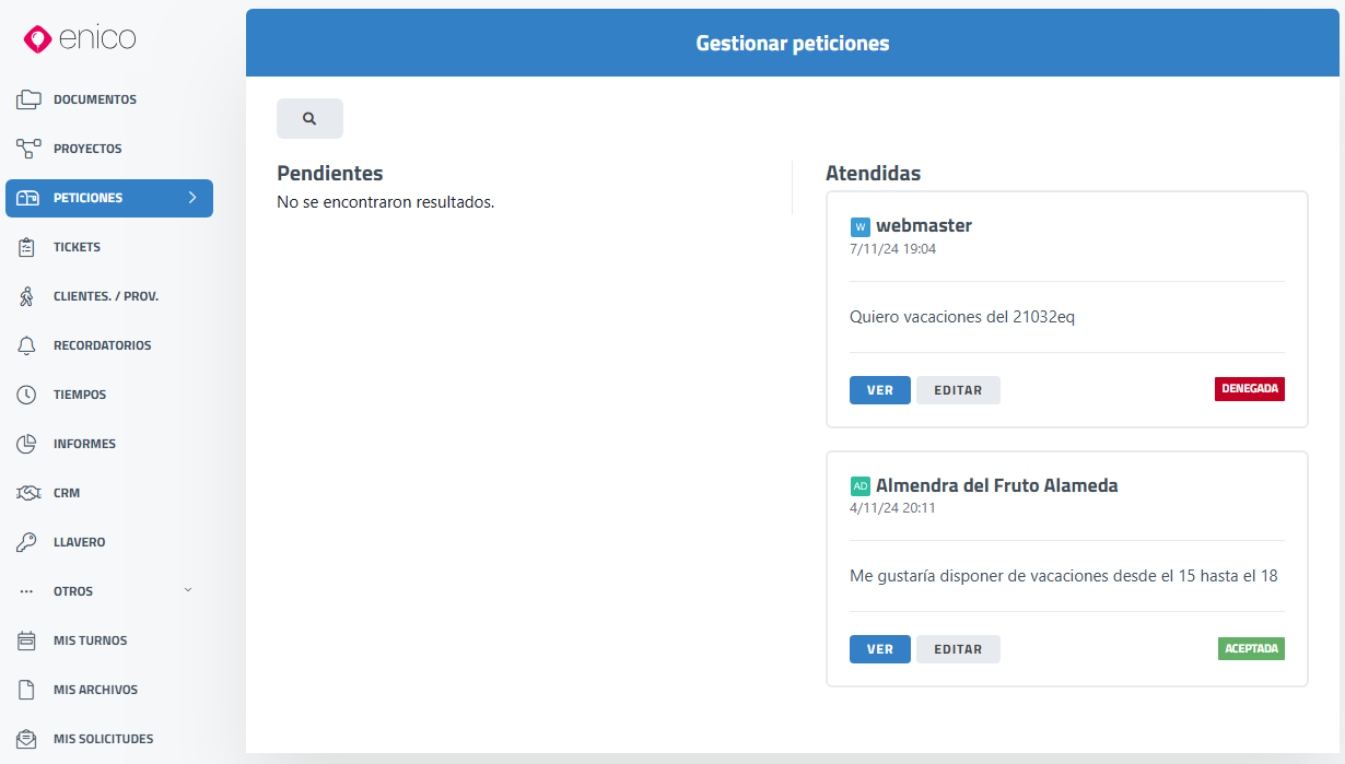 Otra funcionalidad clave en el portal del empleado es el sistema de peticiones. A través de esta herramienta, los empleados pueden realizar solicitudes (como permisos, días de ausencia, etc.), que un usuario autorizado puede revisar y gestionar para aceptarlas o denegarlas de forma ágil e interactiva, facilitando así la comunicación y la eficiencia en la gestión de recursos humanos.