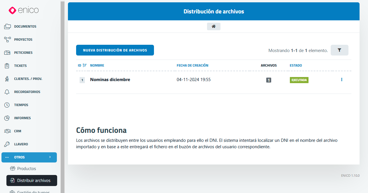 Finalmente, el portal ofrece una herramienta para la distribución de archivos, especialmente útil para la entrega de nóminas. Mediante este sistema, los usuarios autorizados pueden subir documentos de nómina, que se distribuyen automáticamente a los empleados correspondientes según su DNI. Esto garantiza que cada trabajador reciba su nómina de manera segura y ordenada.