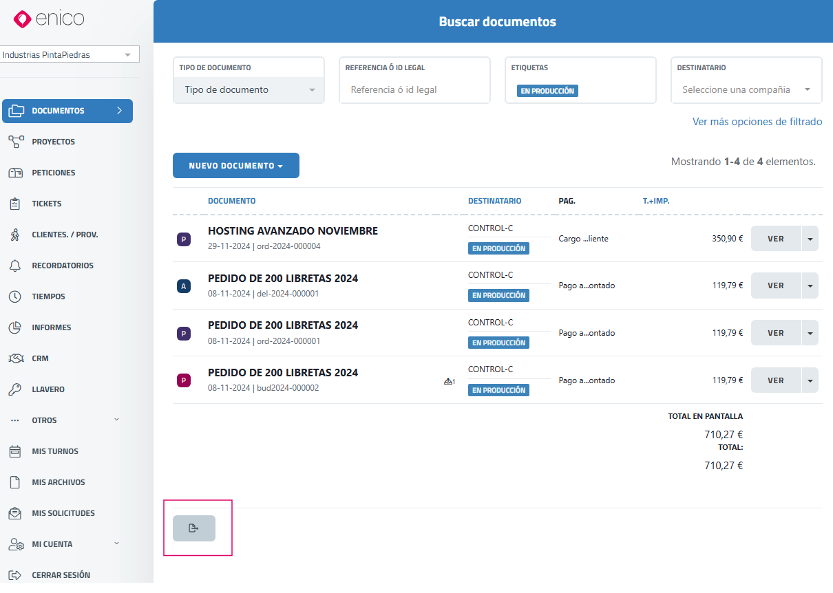 Además de las herramientas de filtrado y la leyenda de colores, la pantalla de Buscar documentos en ENICO ofrece una funcionalidad para exportar los registros de los resultados de la tabla.