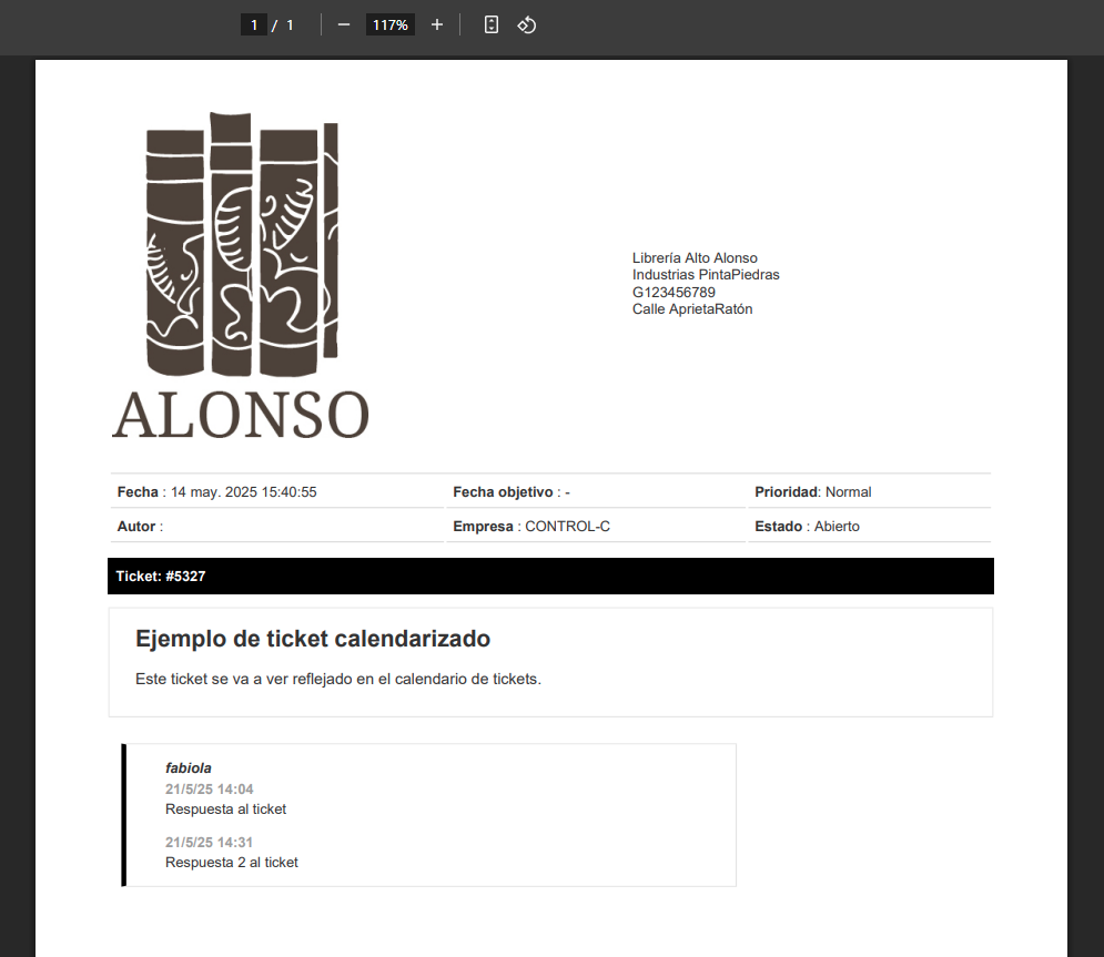El documento PDF generado desde el ticket recoge todos los elementos relevantes para su correcta identificación y seguimiento: