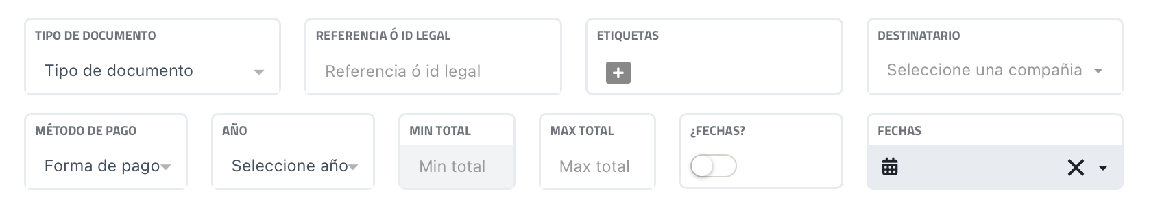 7. Min total / Max total: Campos para establecer un rango de importes, filtrando documentos dentro de un umbral específico de cantidades.