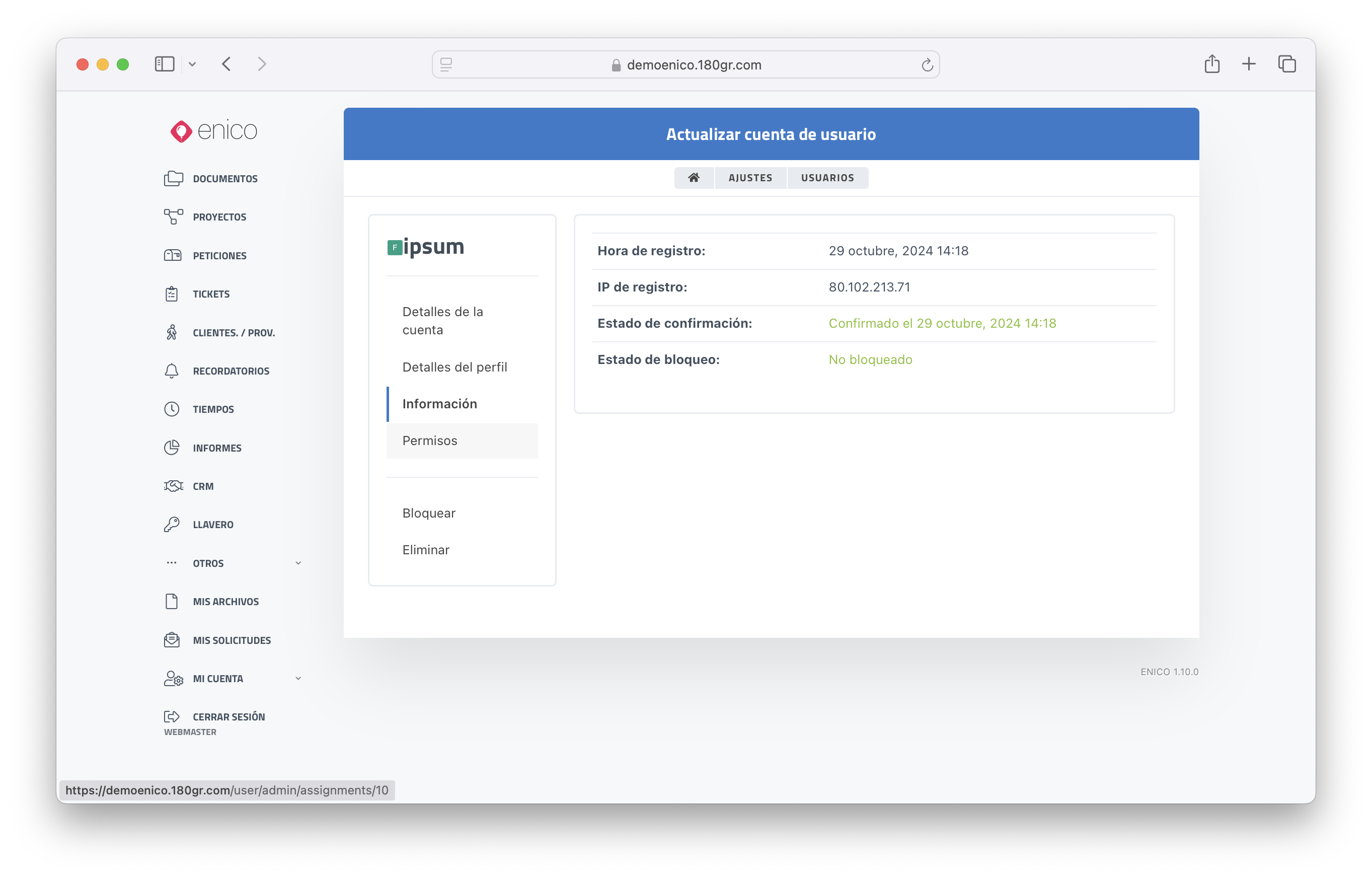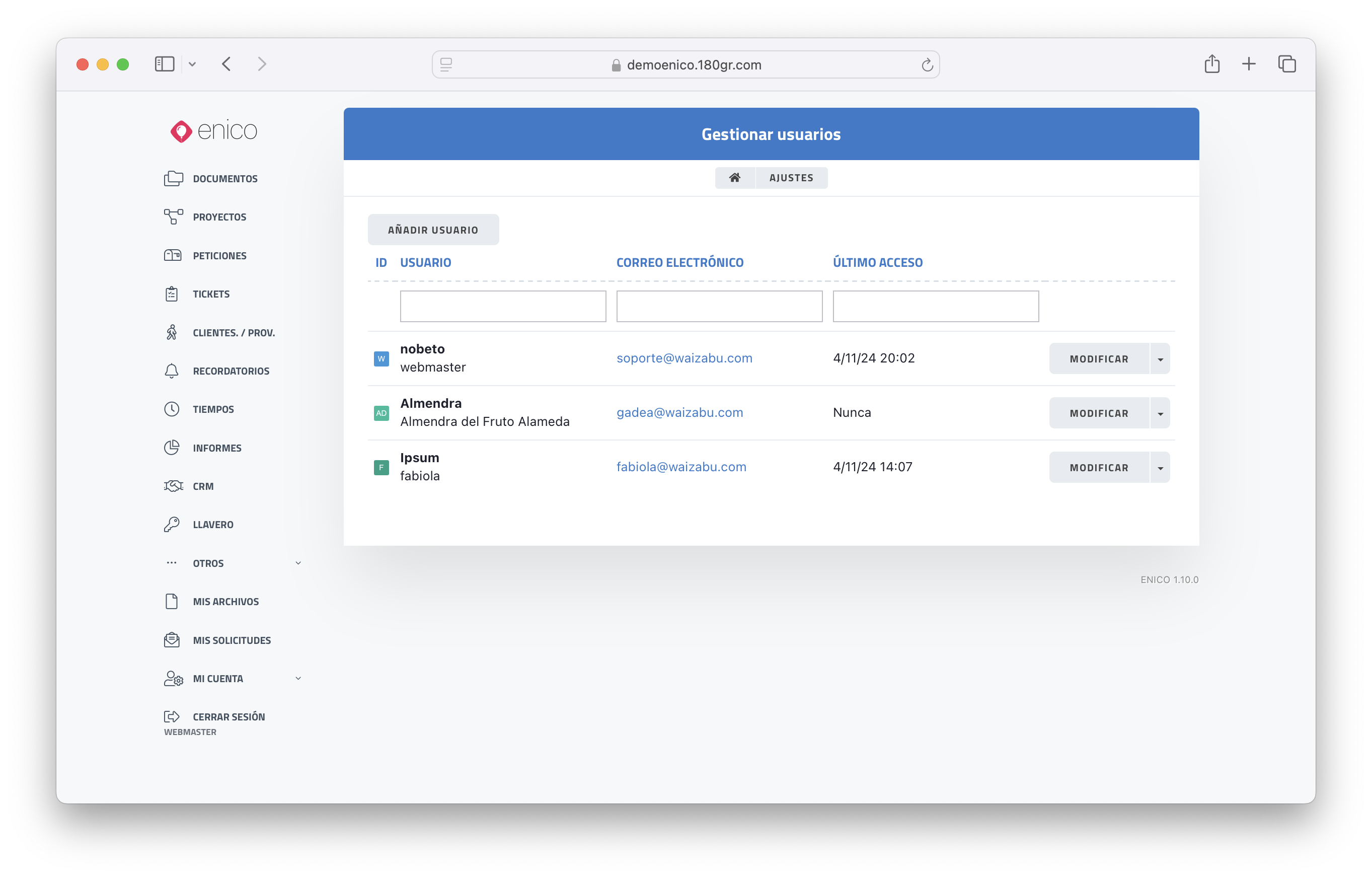En ENICO, se pueden crear tantos usuarios como se considere necesario para el funcionamiento óptimo del sistema. A continuación, se describen las características y acciones relacionadas con la gestión de usuarios.