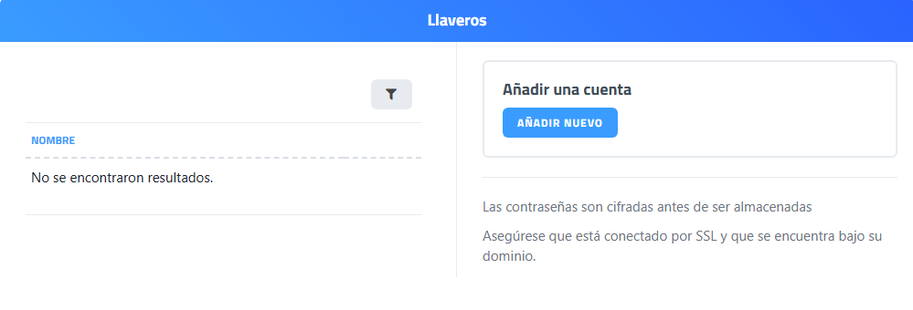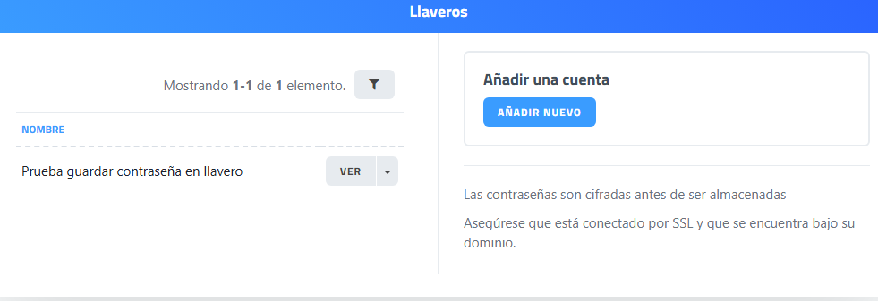Los usuarios que tengan permiso para acceder al módulo llavero tendrán acceso solo a las contraseñas de cada uno. No verán en el listado de contraseñas las de otros usuarios que también tienen permisos para acceder al módulo llavero.