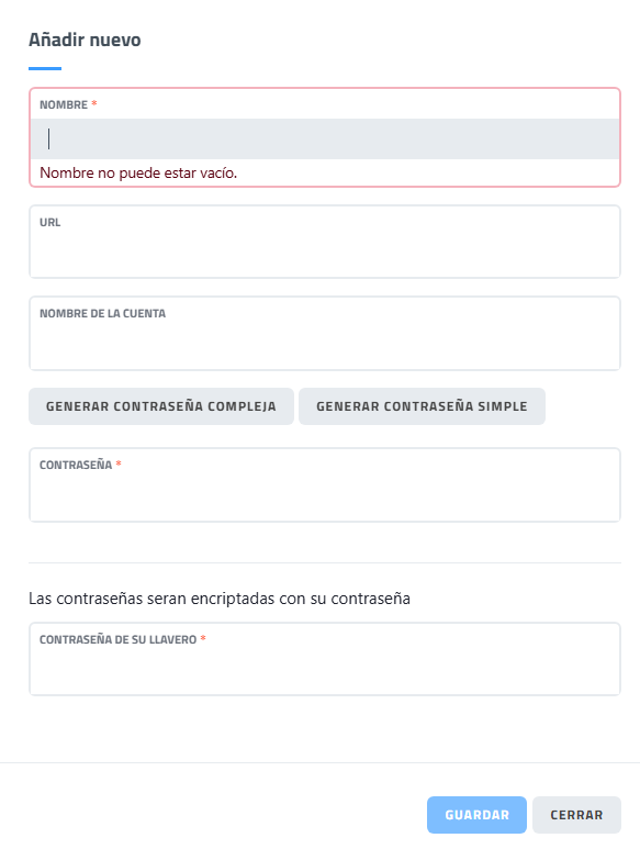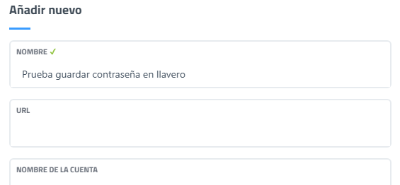 Requiere un nombre. Este nombre es para poder reconocer, filtrar y encontrar la contraseña. Se verá en el listado de contraseñas del llavero sin requerir que el usuario se autentifique con la contraseña PRINCIPAL.