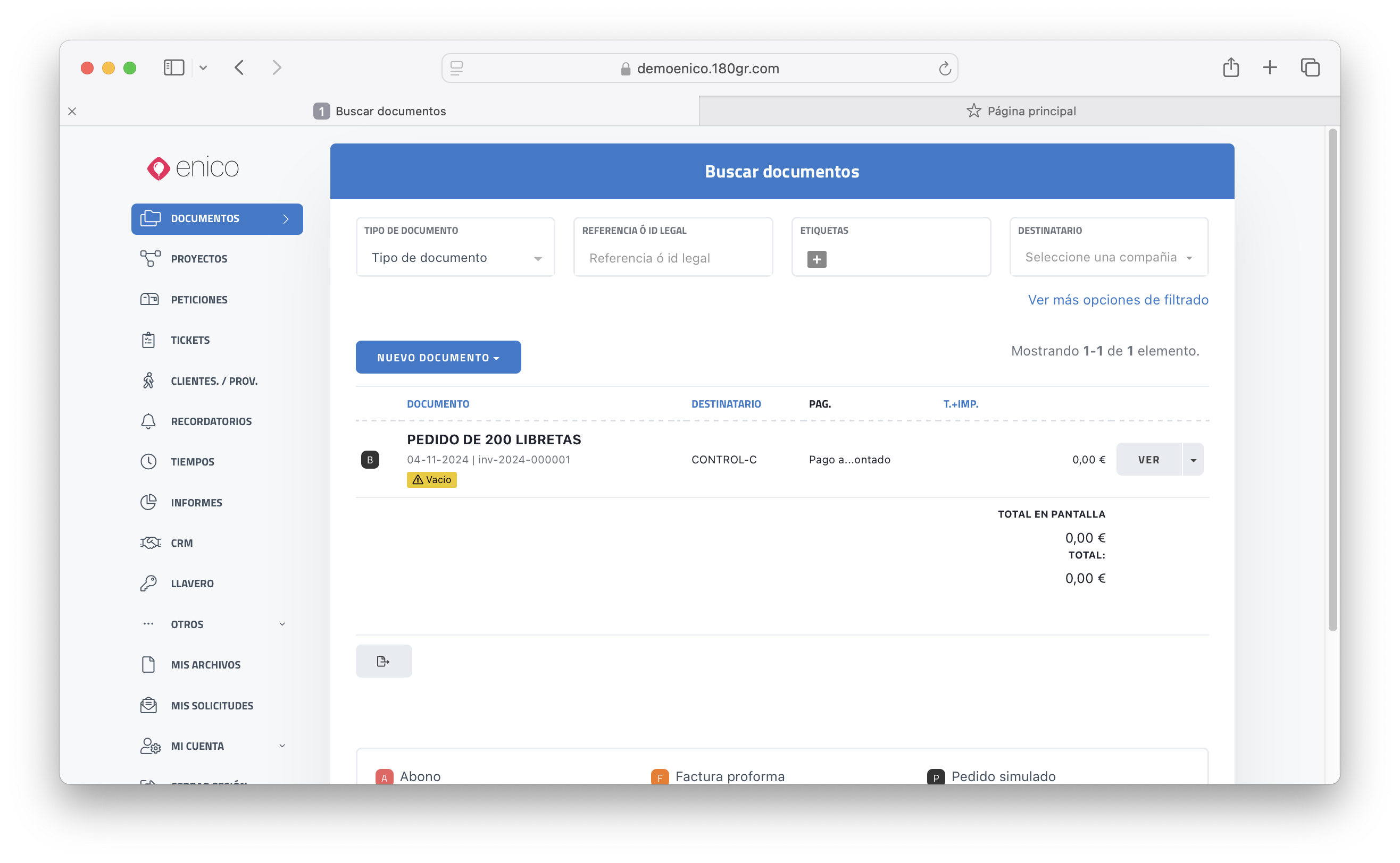 Al hacer clic en la opción Documentos en el menú izquierdo o en el enlace destacado, accedemos a la pantalla principal de gestión de documentos de venta. Esta vista presenta una tabla resumen de todos los documentos generados en ENICO, independientemente de su tipo (facturas, presupuestos, pedidos, etc.). La tabla facilita la visualización de los documentos de manera organizada y permite tener un acceso rápido a la información relevante de cada uno.
