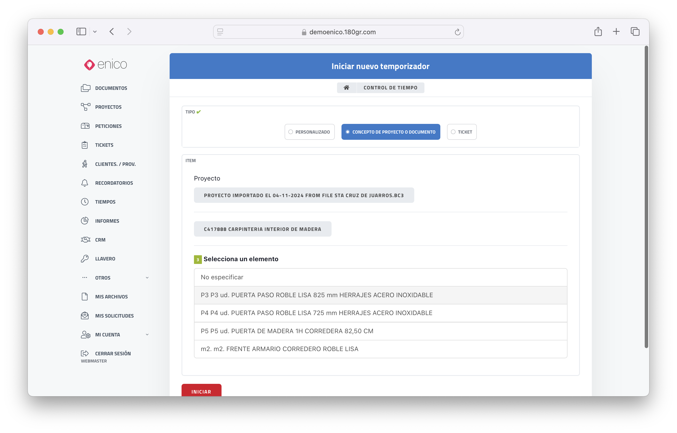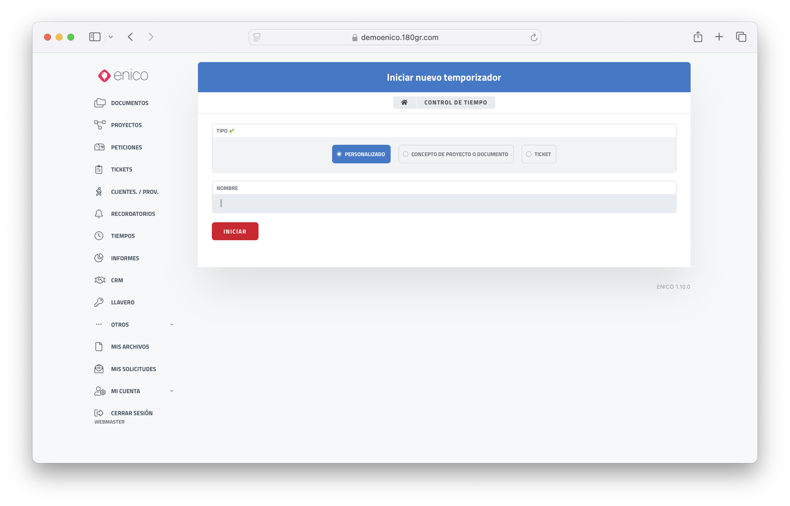 El módulo de control de tiempos en ENICO permite iniciar un contador de tiempo de diferentes formas, adaptándose a distintas necesidades según el tipo de tarea o actividad que se desee registrar. A continuación, se explican las tres opciones disponibles para iniciar un nuevo contador de tiempo: