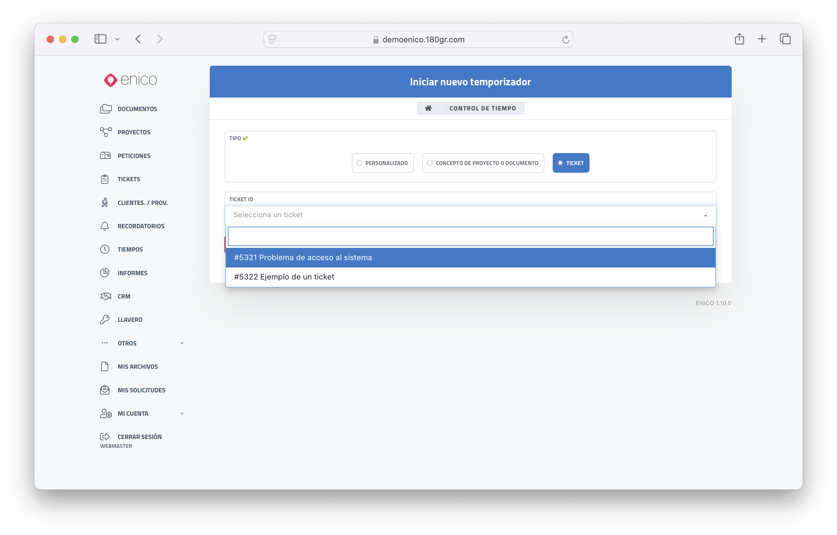 La tercera opción disponible es Ticket, una funcionalidad especialmente útil para aquellos usuarios que están realizando un seguimiento del tiempo en relación con solicitudes o tareas específicas de soporte o gestión.
