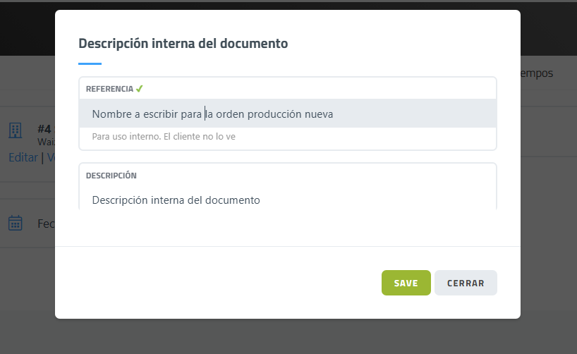 A tener en cuenta a la hora de crear una orden de producción a partir de un documento. Si el documento tiene referencia interna y/o Descripción, creará la orden con estos datos y los mostrará en el encabezado de color negro.