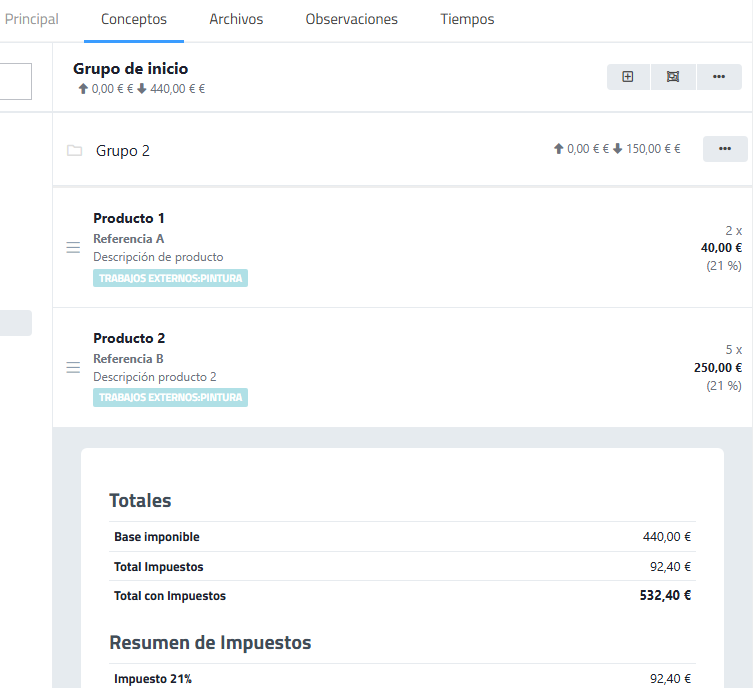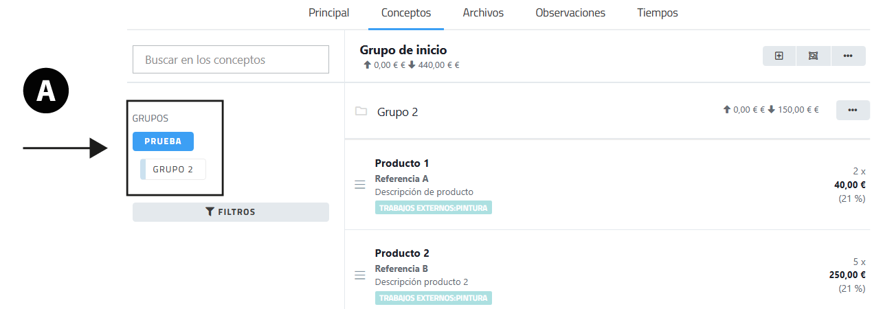 Grupo en el que se encuentran los conceptos. Una orden de producción puede tener más de un grupo de conceptos. Incluye un sistema de ordenación de conceptos por importe de mayor a menor y viceversa. |