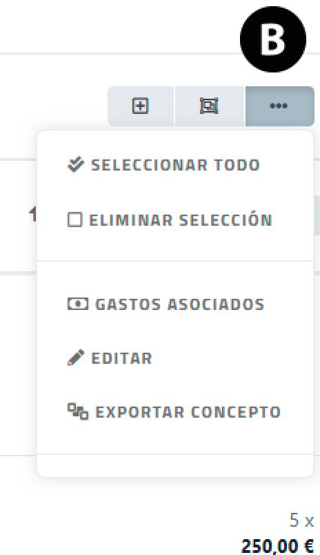 - Gastos asociados. Para acceder a la interfaz de creación, control y actualización de gastos asociados al documento o a un grupo e conceptos concreto.