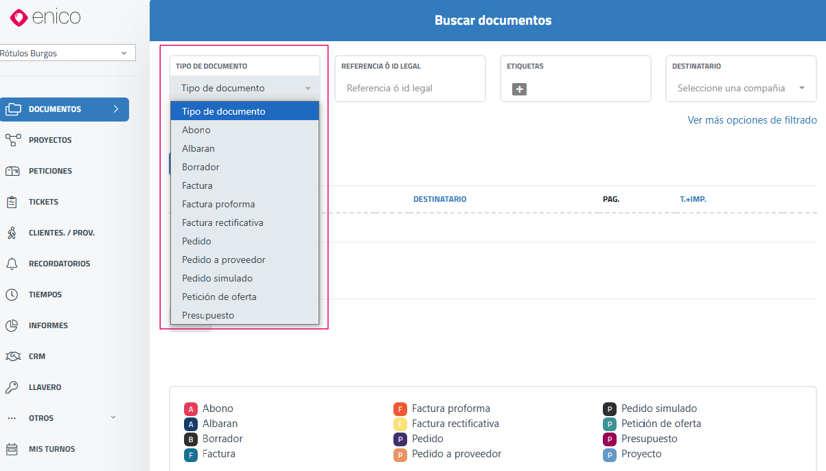 Además de los documentos de venta estándar, ENICO incluye un tipo de documento llamado “proyectos”, que tiene una presentación visual ligeramente distinta, aunque, a nivel interno, sigue funcionando como cualquier otro documento de venta.