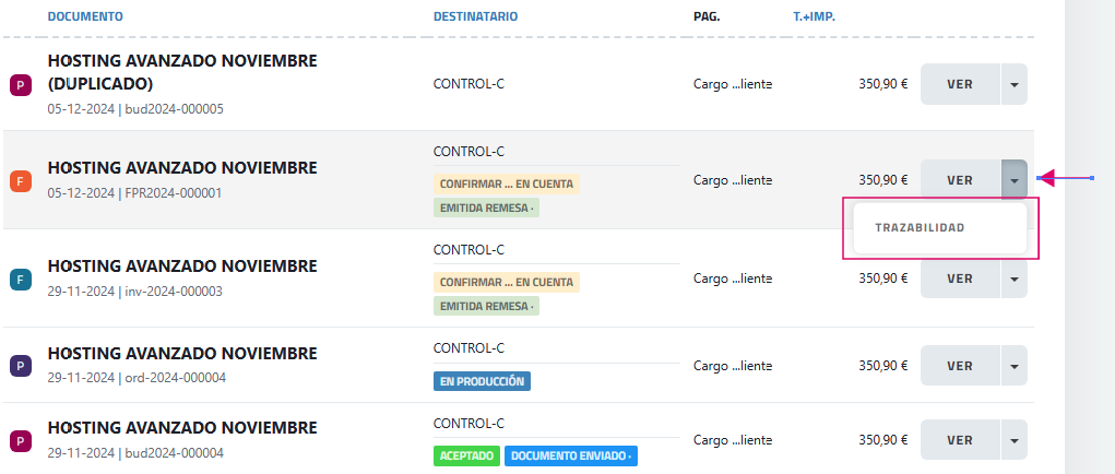 También se puede acceder a la trazabilidad con información ampliada desde el botón del documento visto en la lista de documentos.