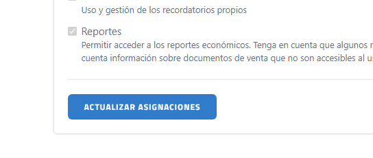 Los cambios en las asignaciones de permisos a usuarios requieren guardado. Para ello la interfaz de permisos presenta botón nombrado "Actualización de Asignaciones", uno en la zona superior y otro en la zona inferior de la interfaz.