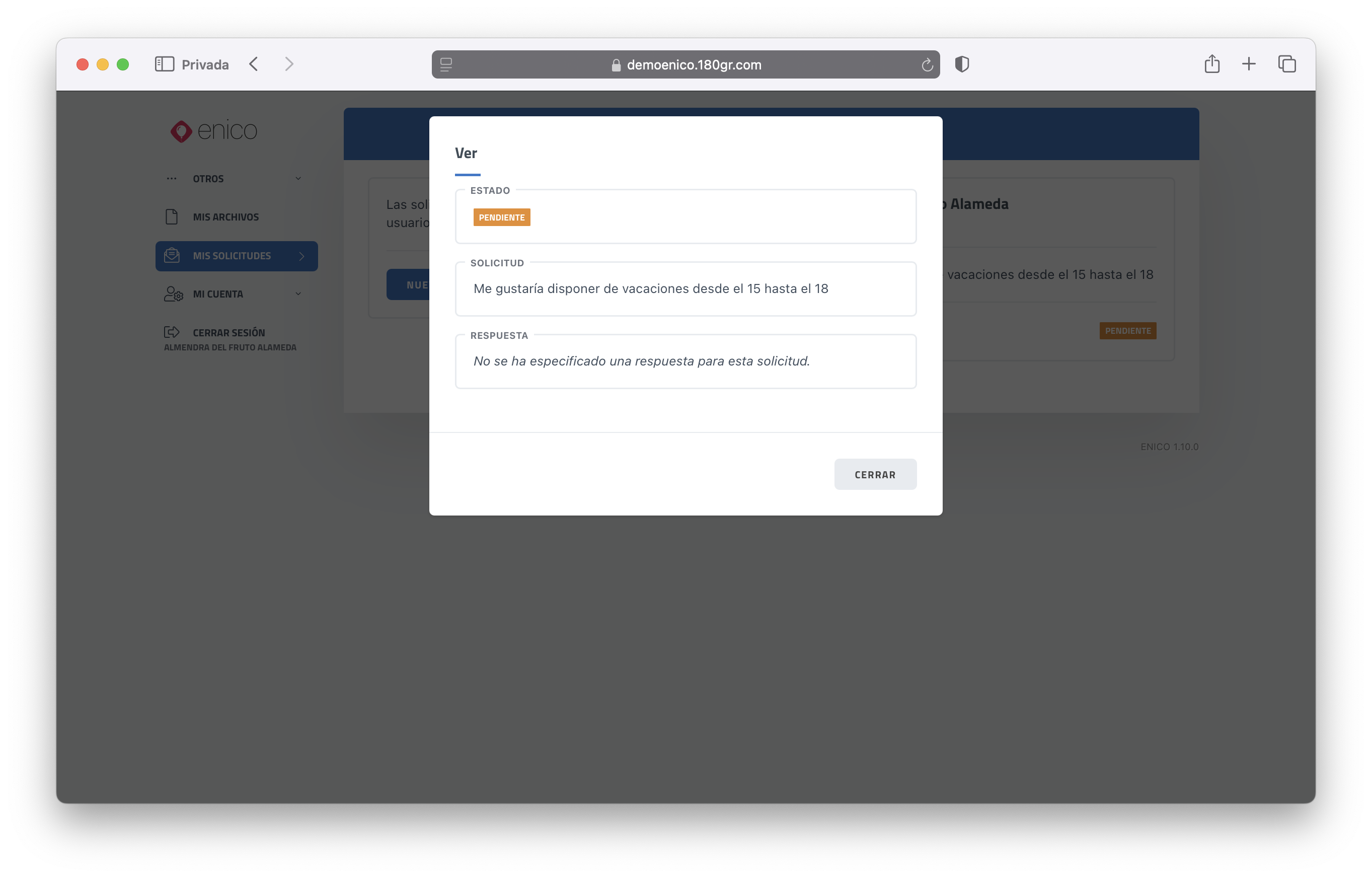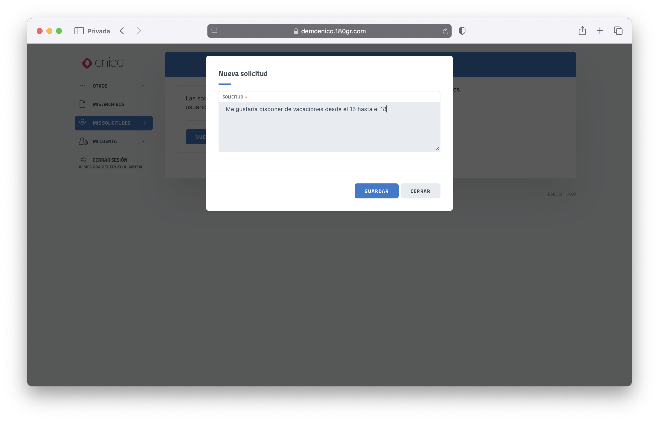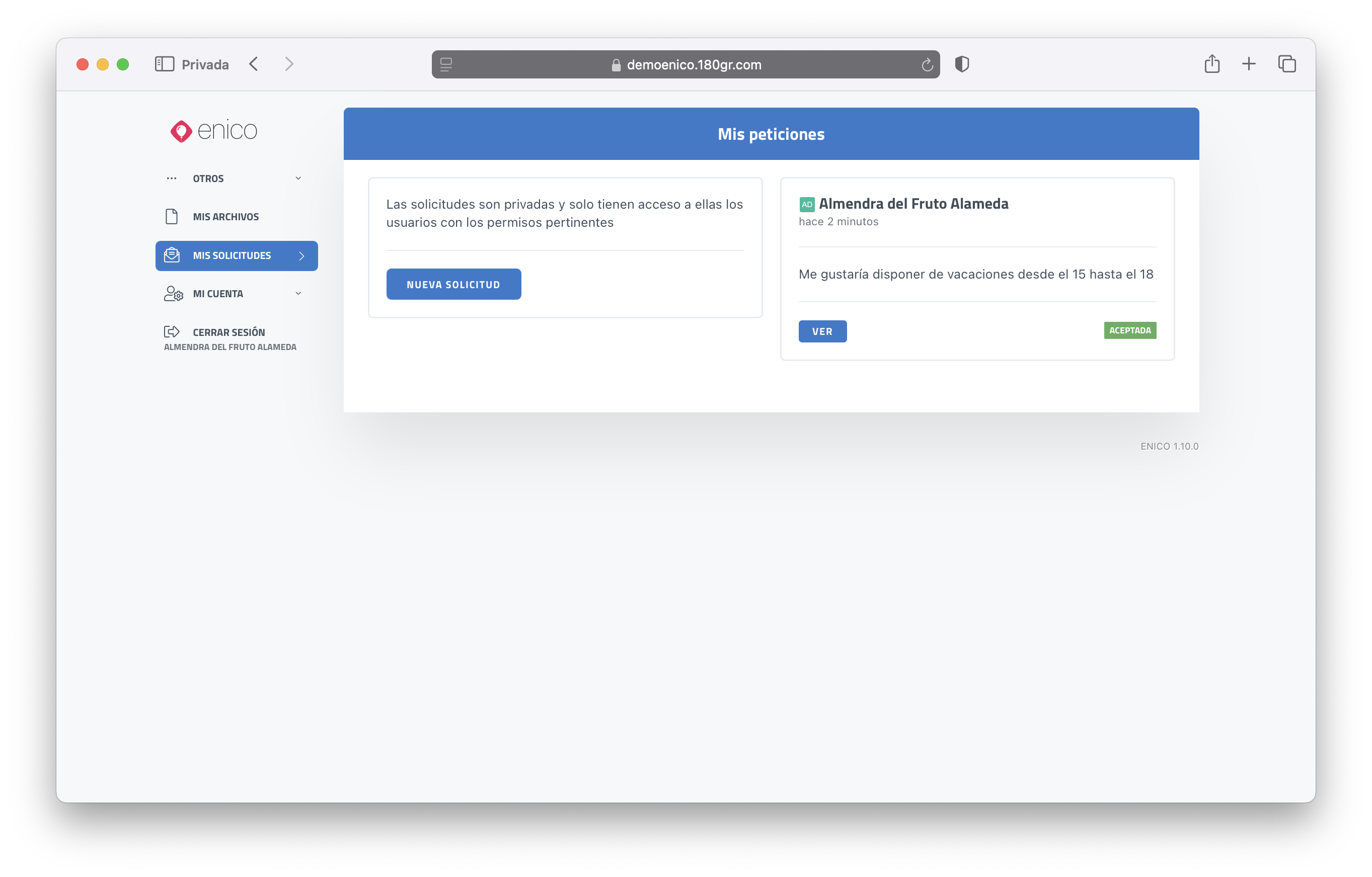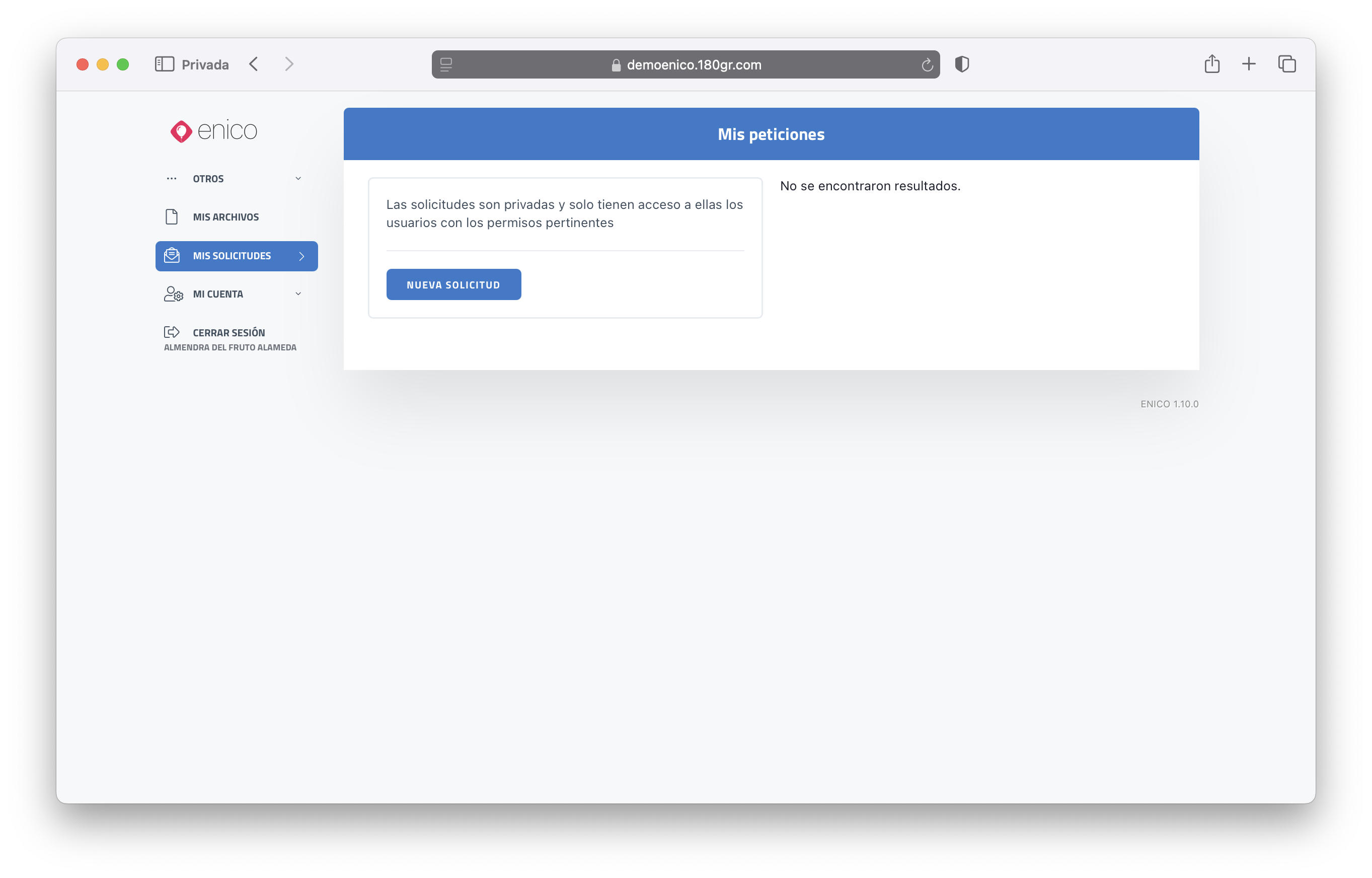 •Registro en Mis Solicitudes: La nueva solicitud se registra automáticamente en la sección “Mis solicitudes”, permitiendo al usuario realizar un seguimiento de su estado.