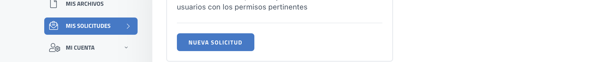 1. Generación de Solicitud: Desde el menú izquierdo, el usuario selecciona la opción Mis solicitudes y luego crea una nueva solicitud.