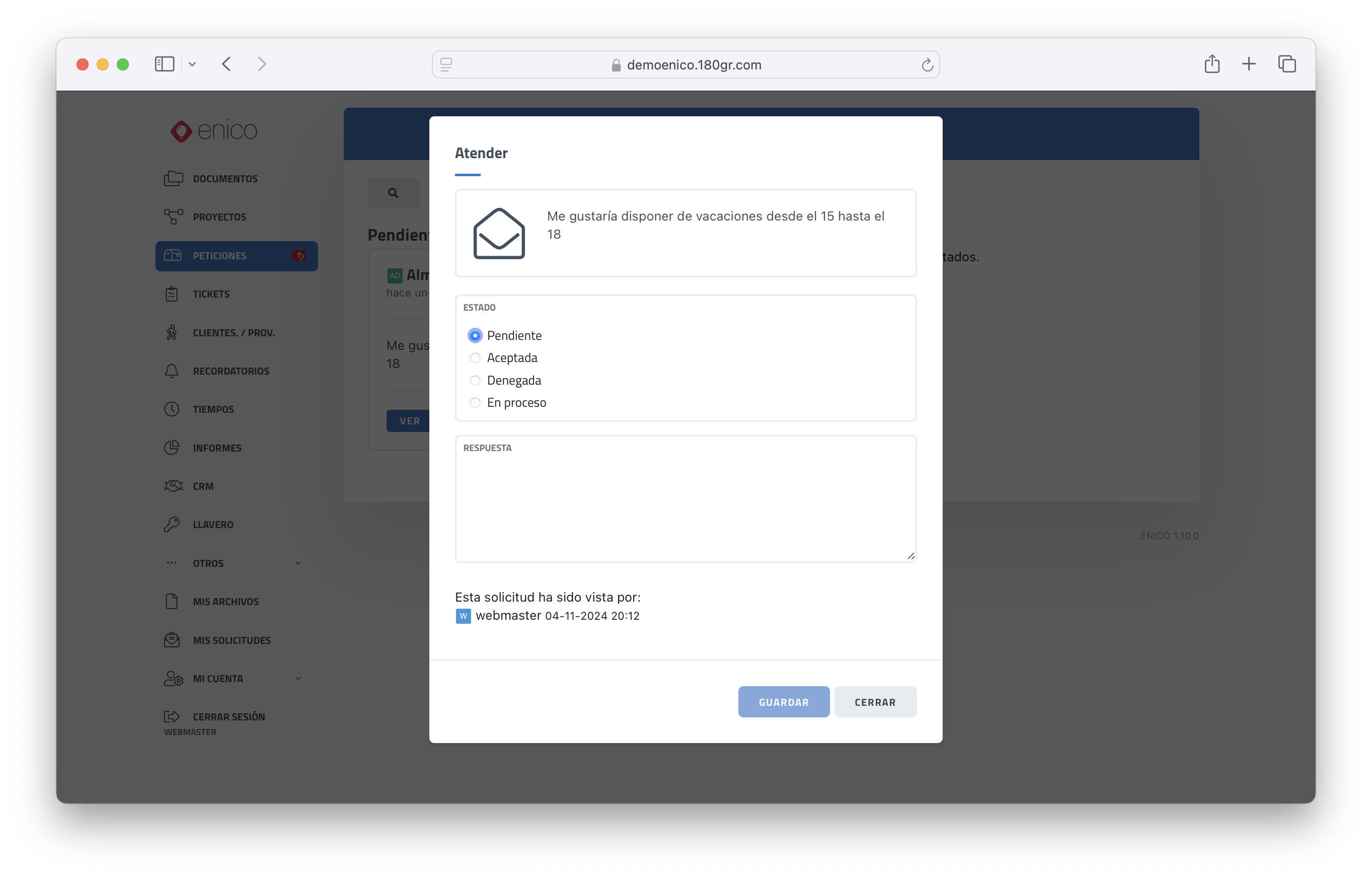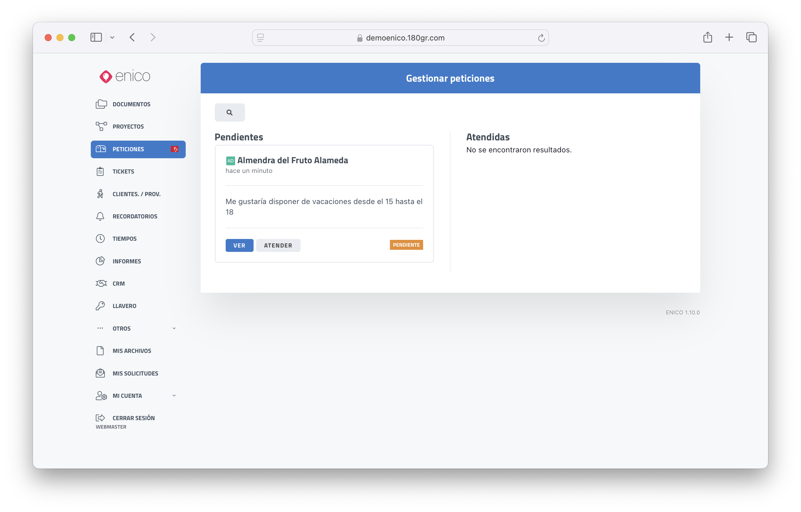 El módulo de peticiones permite a los usuarios gestionar solicitudes de manera eficiente y organizada. A continuación, se detalla el proceso de creación y administración de solicitudes.