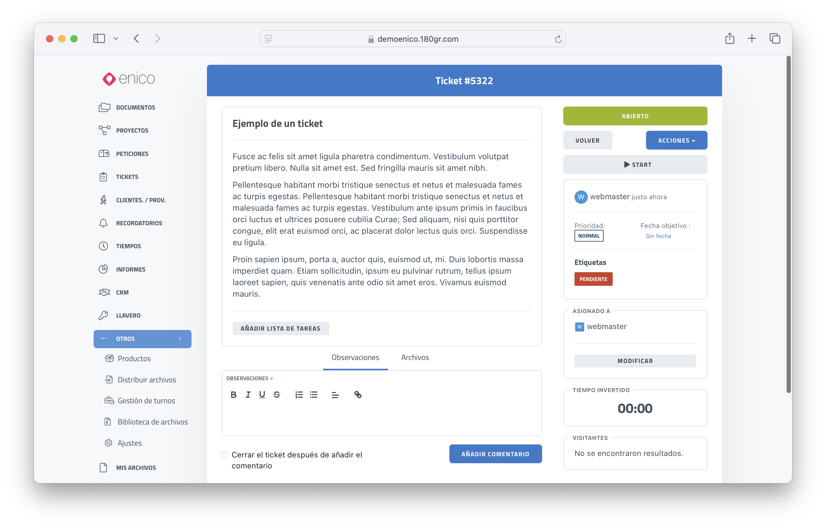Esta estructura organizada permite gestionar y visualizar de forma clara todos los aspectos relevantes de un ticket, facilitando tanto la colaboración como el seguimiento detallado de cada solicitud en ENICO.