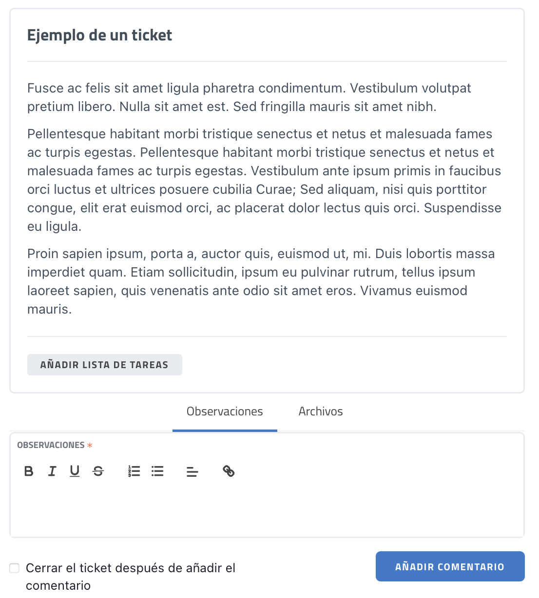 Observaciones: Espacio dedicado a comentarios adicionales. Cualquier usuario con acceso puede añadir observaciones que quedarán registradas con su nombre. Esto permite una comunicación fluida y un historial claro de las interacciones relacionadas con el ticket. (El proceso para añadir observaciones se describirá en otra página).